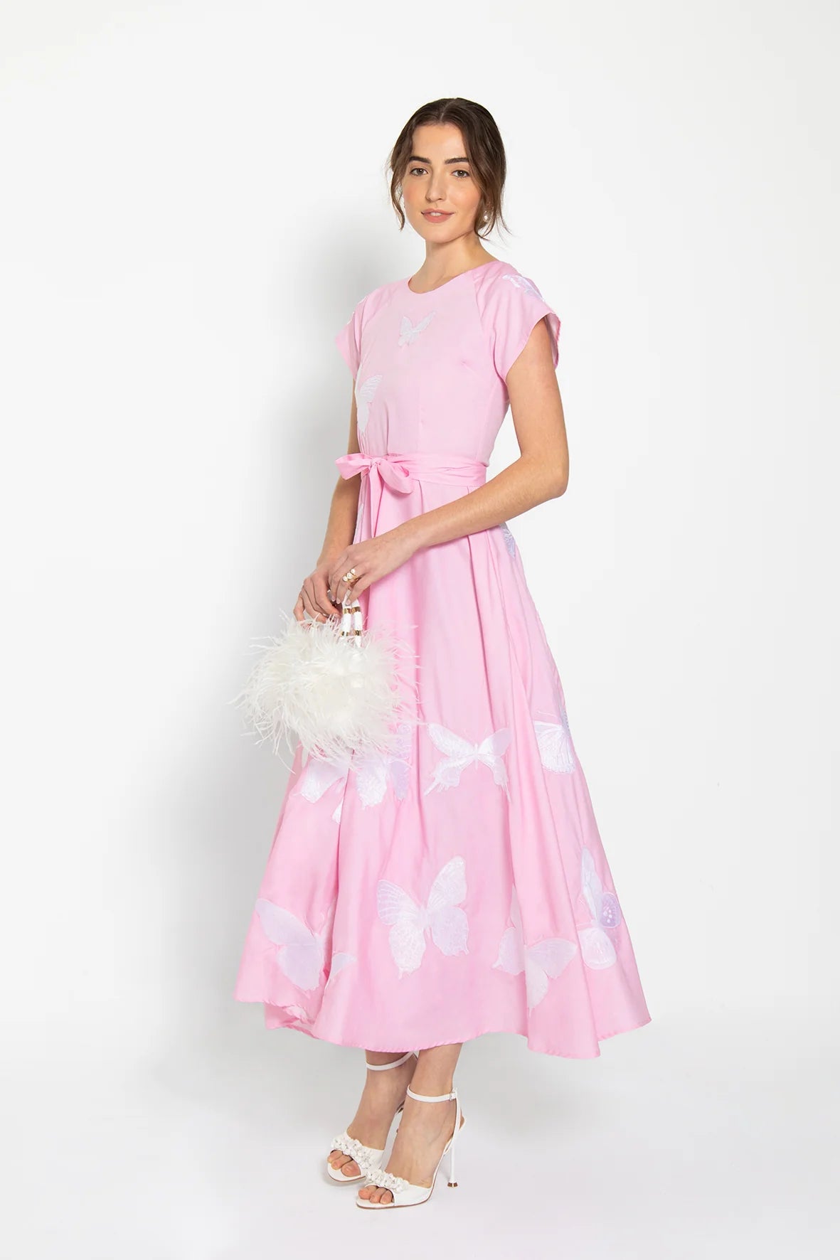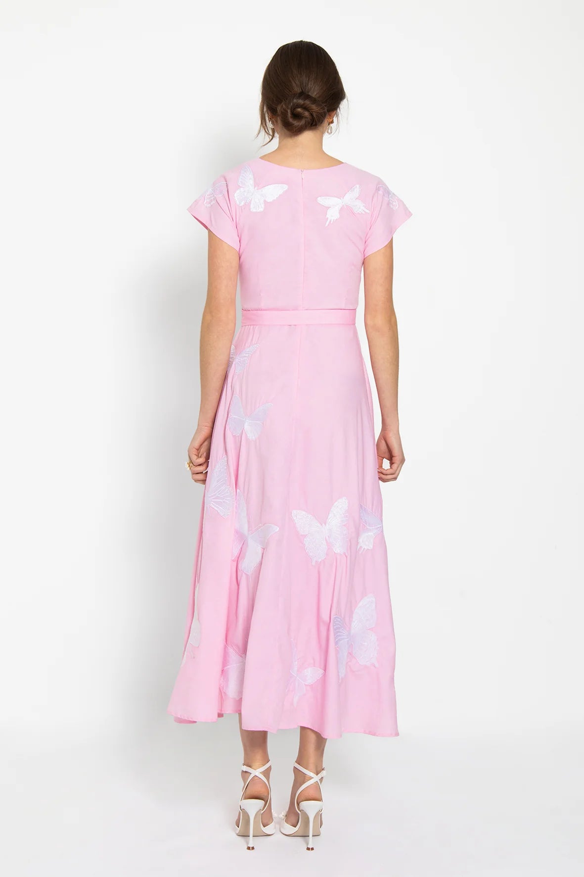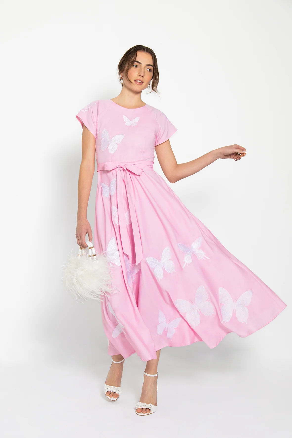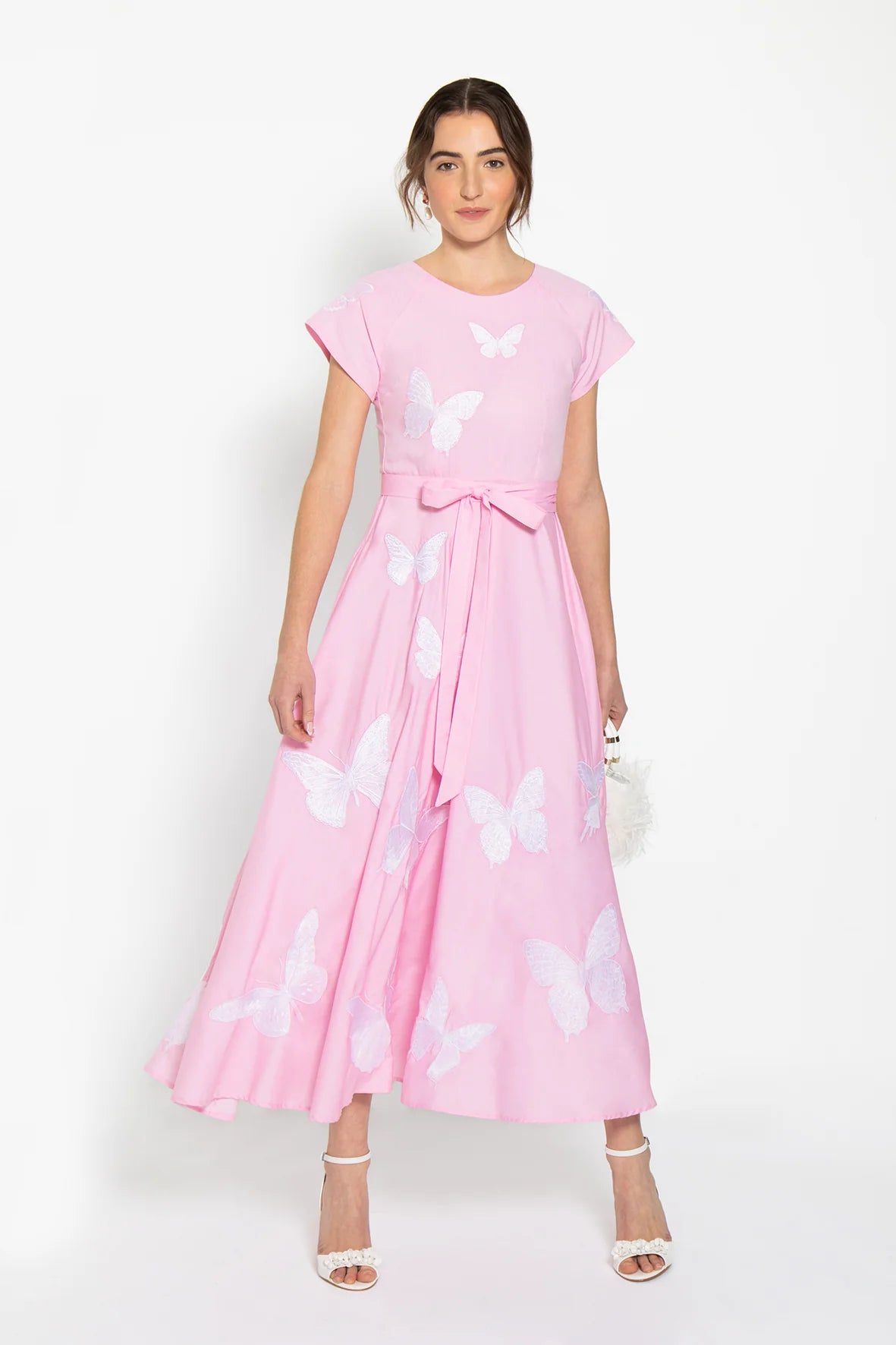 This cotton poplin maxi dress features an A-line silhouette with delicate all-over butterfly embroidery. Crafted from textured pink and white fabric with a subtle dotted finish, it’s complete with a detachable tie waist belt for a customizable fit—perfect for warm-weather occasions and effortless elegance.