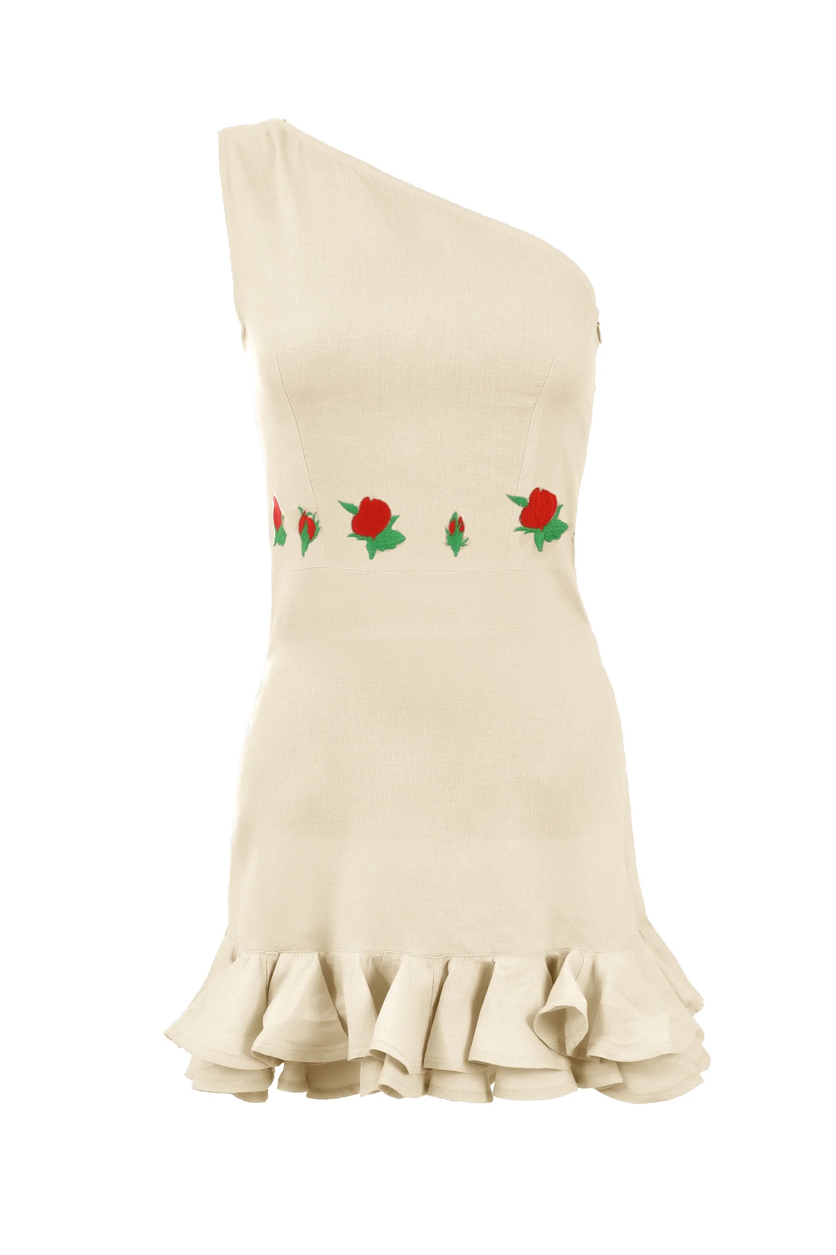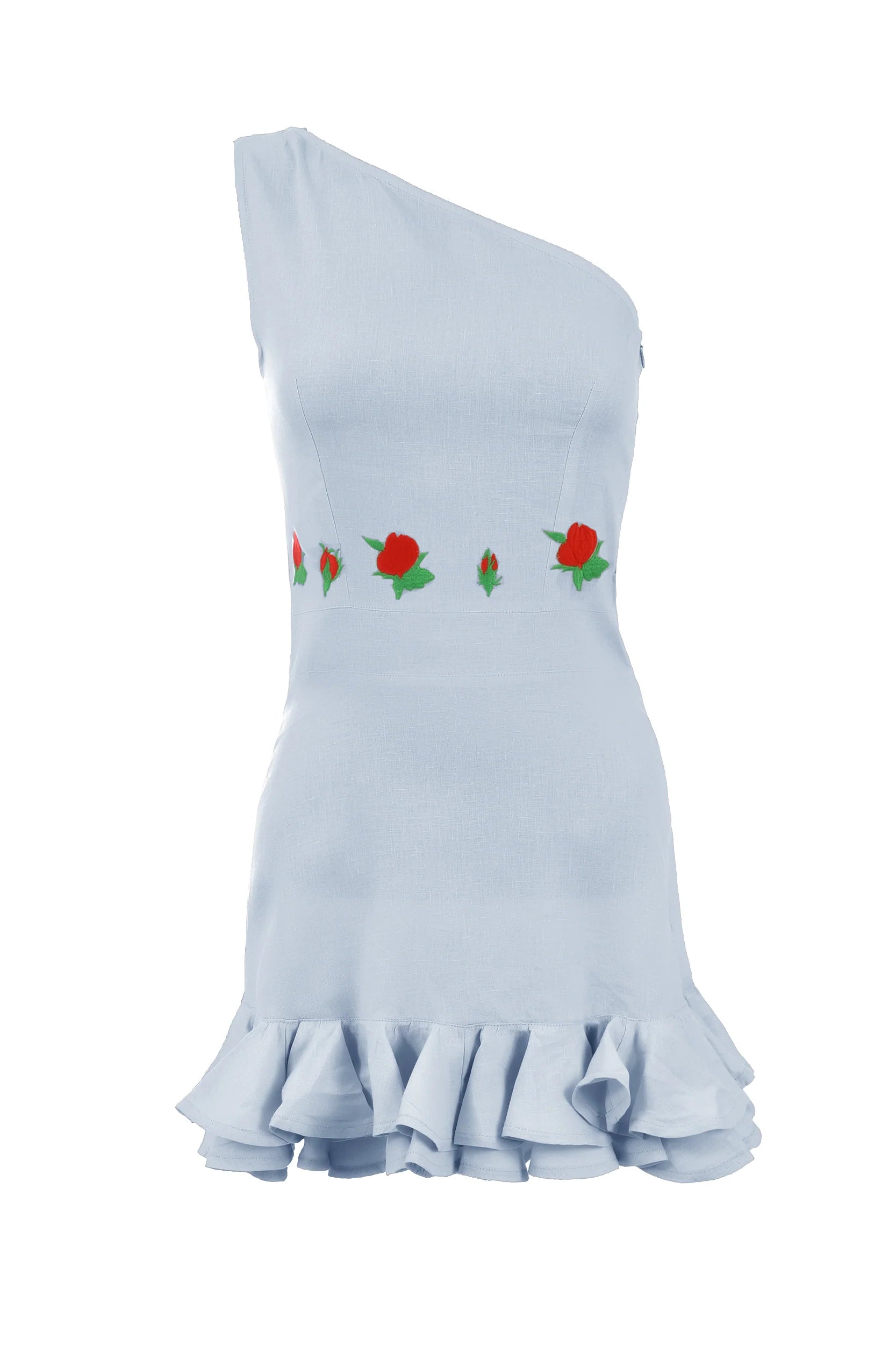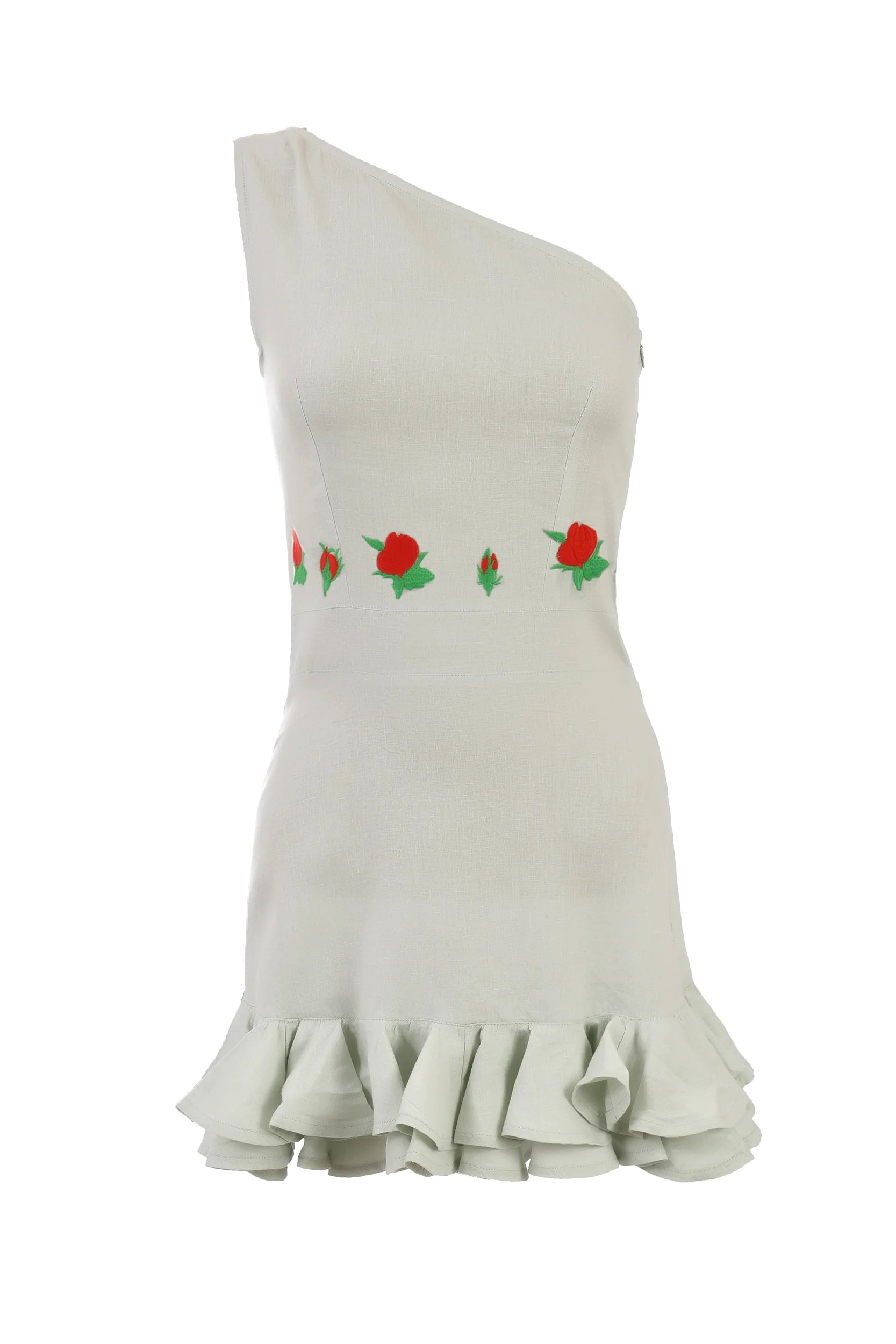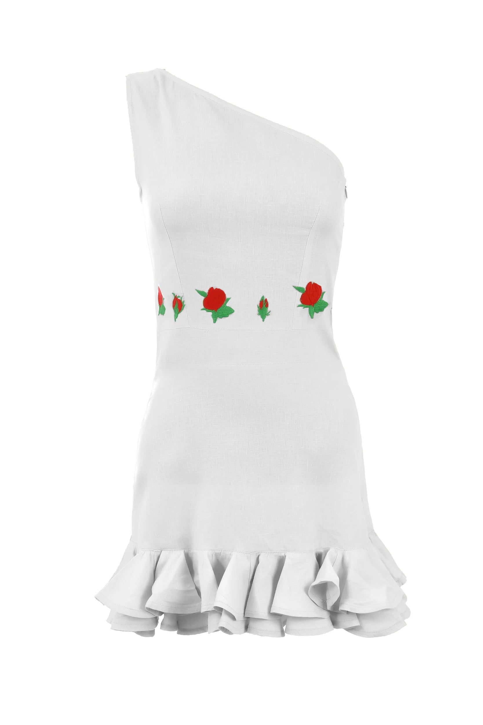 Mini cotton dress with a chic one-shoulder design, featuring a ruffle hem and delicate rose floral embroidery at the waist. Perfect for making a stylish statement.