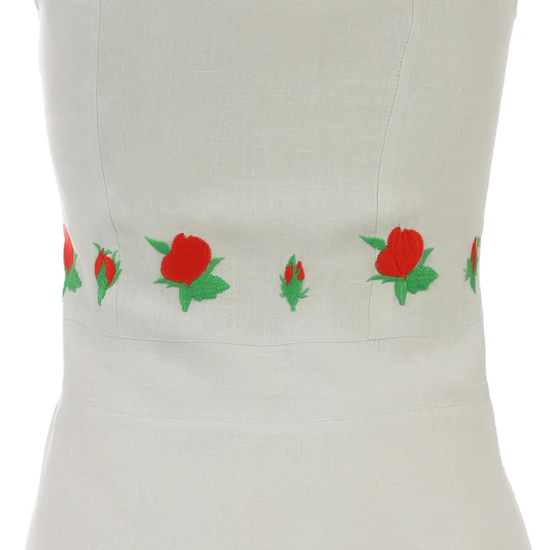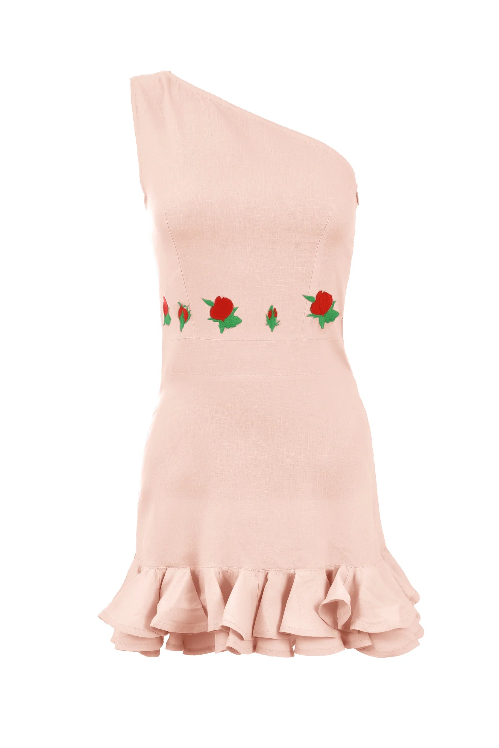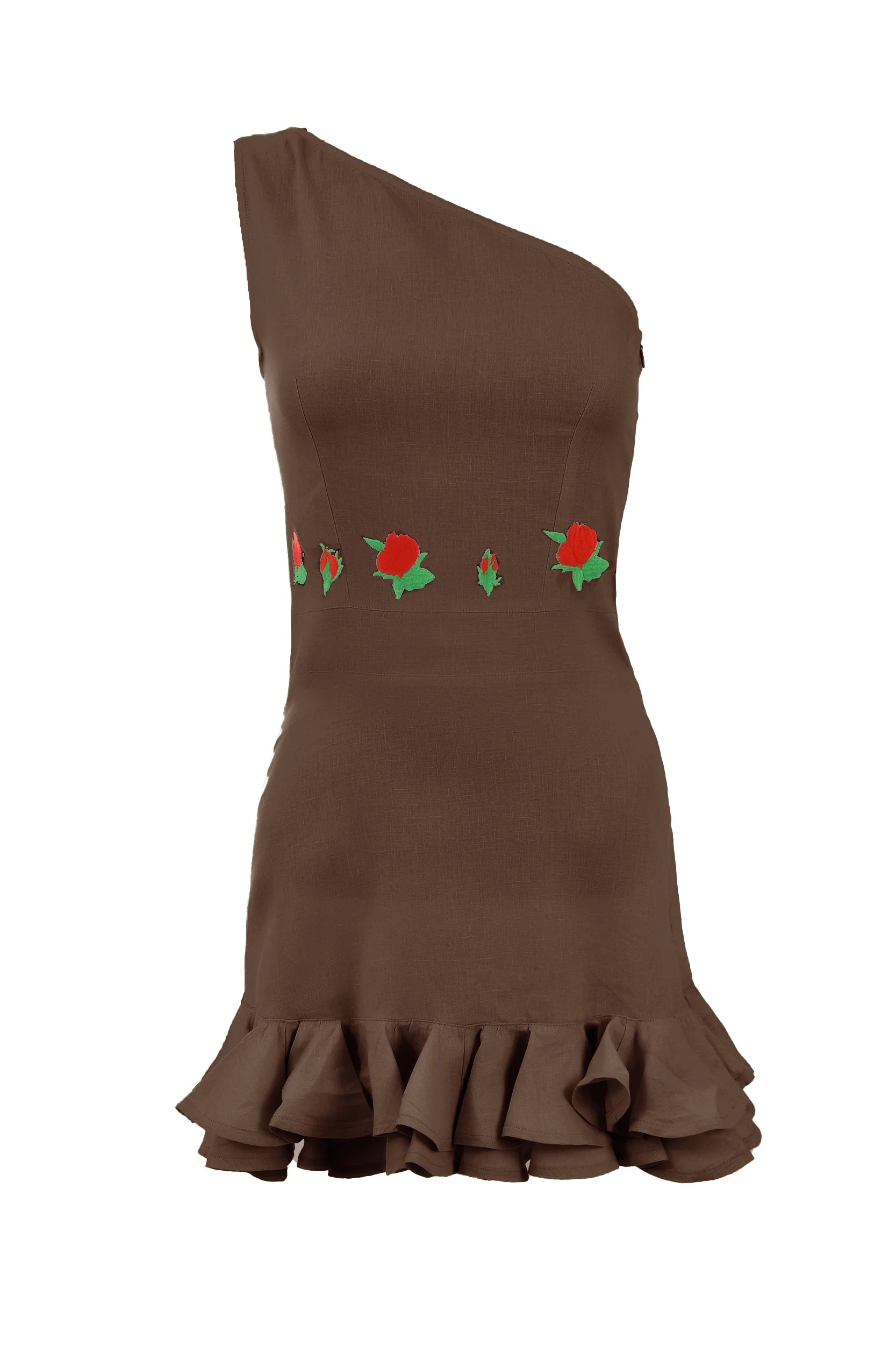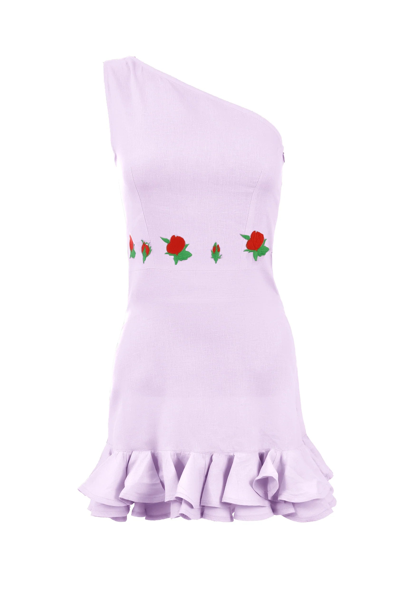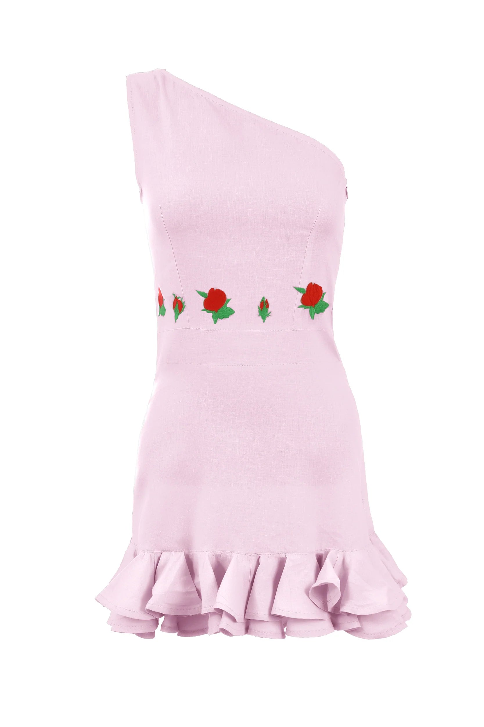 Mini cotton dress with a chic one-shoulder design, featuring a ruffle hem and delicate rose floral embroidery at the waist. Perfect for making a stylish statement.