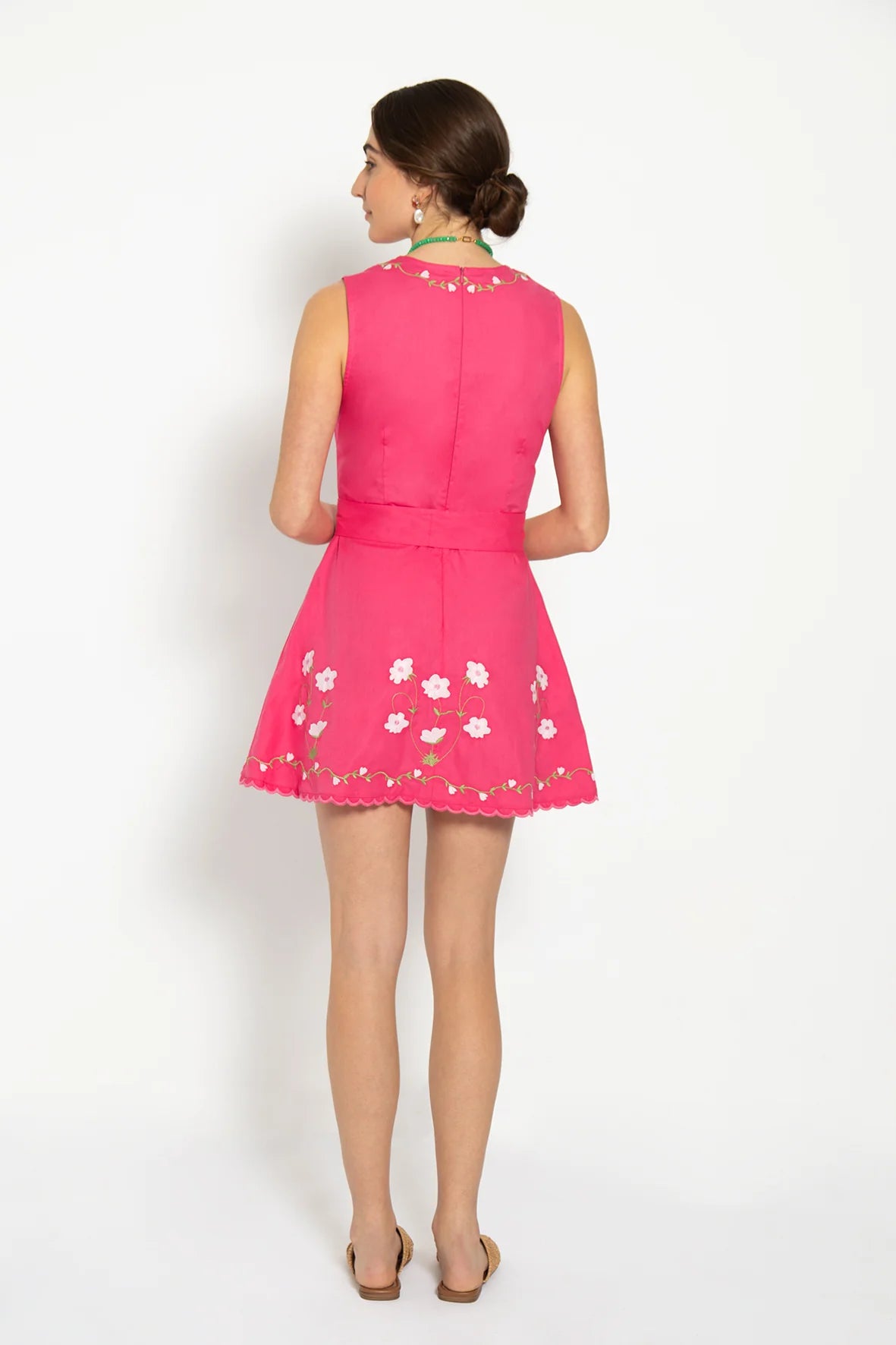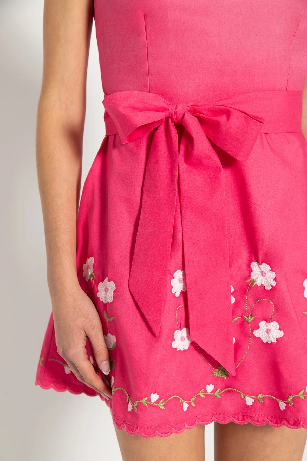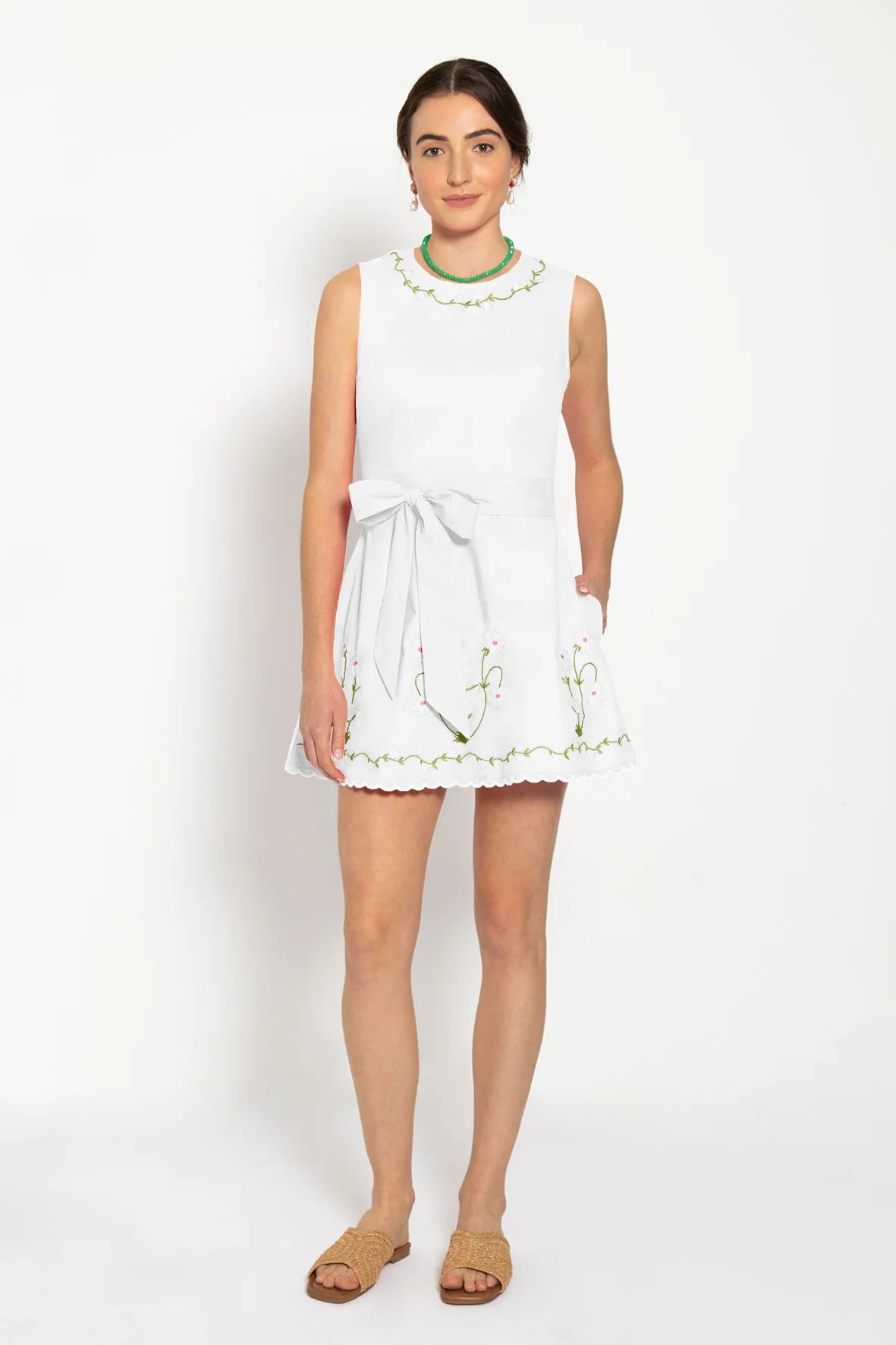 This charming 100% cotton mini dress features delicate floral embroidery of summer poppies, a scalloped hemline, and an optional tie waist for a customizable fit. It’s perfect for sunny day outings.
