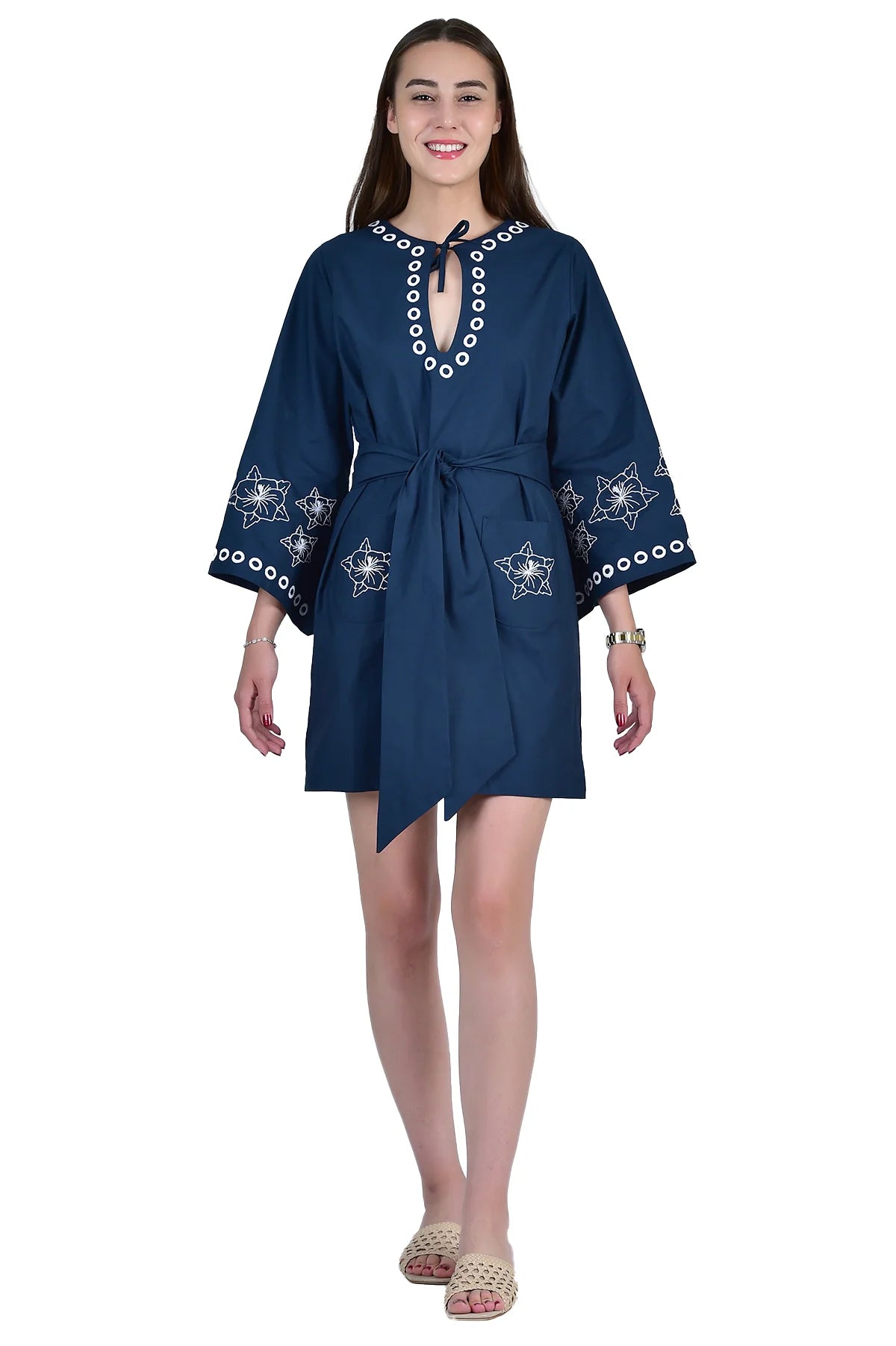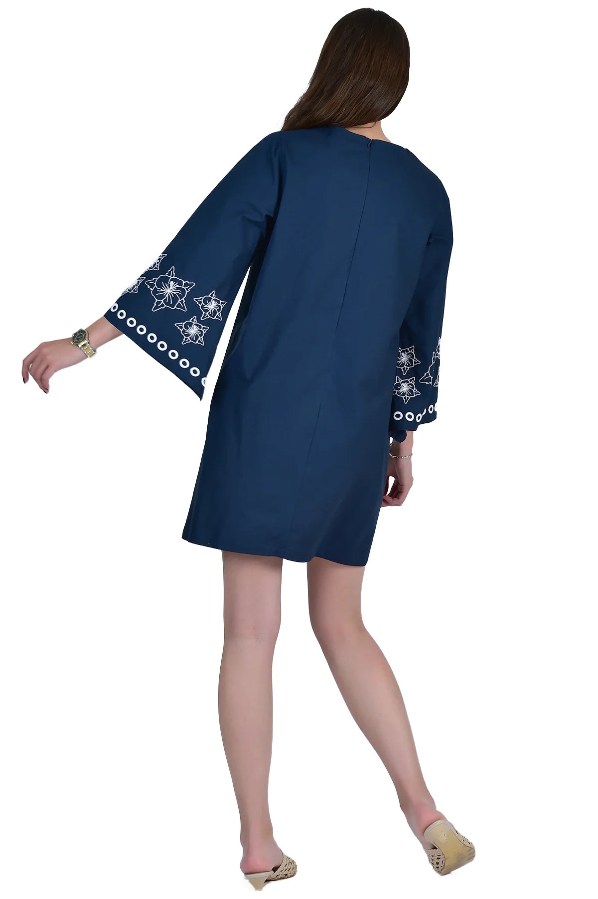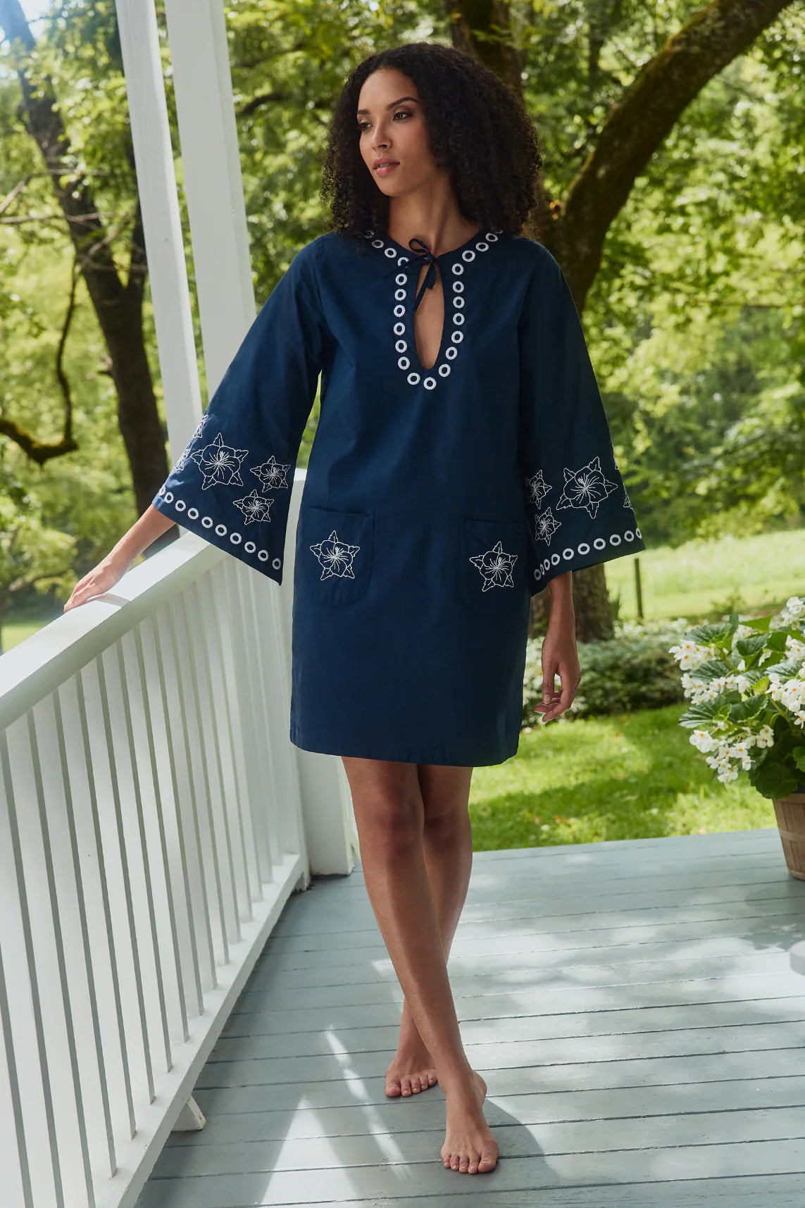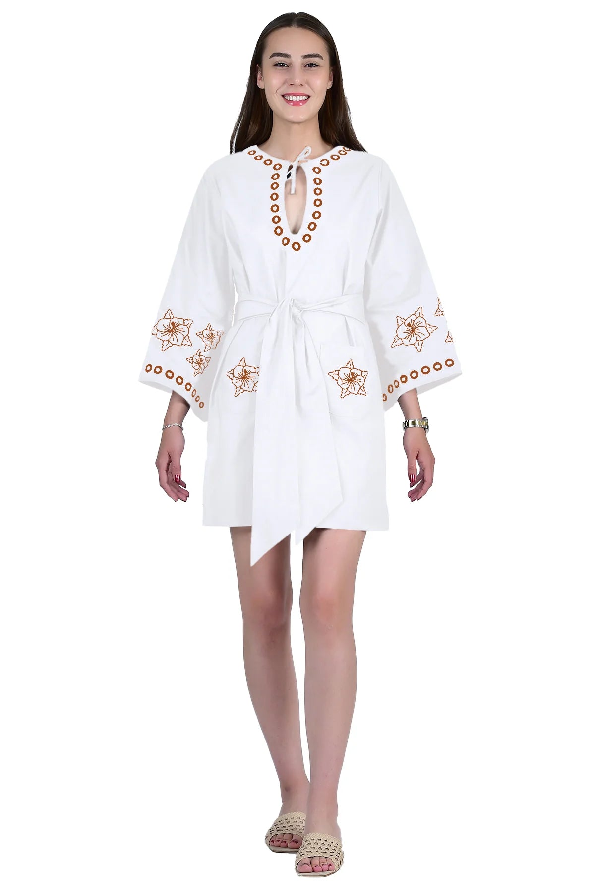 Breezy and effortlessly chic, this dress combines comfort and sophistication with its relaxed tunic silhouette. Crafted from lightweight 100% poplin cotton, it features intricate floral embroidery and eyelet detailing along the neckline, sleeves, and hem for a polished finish.