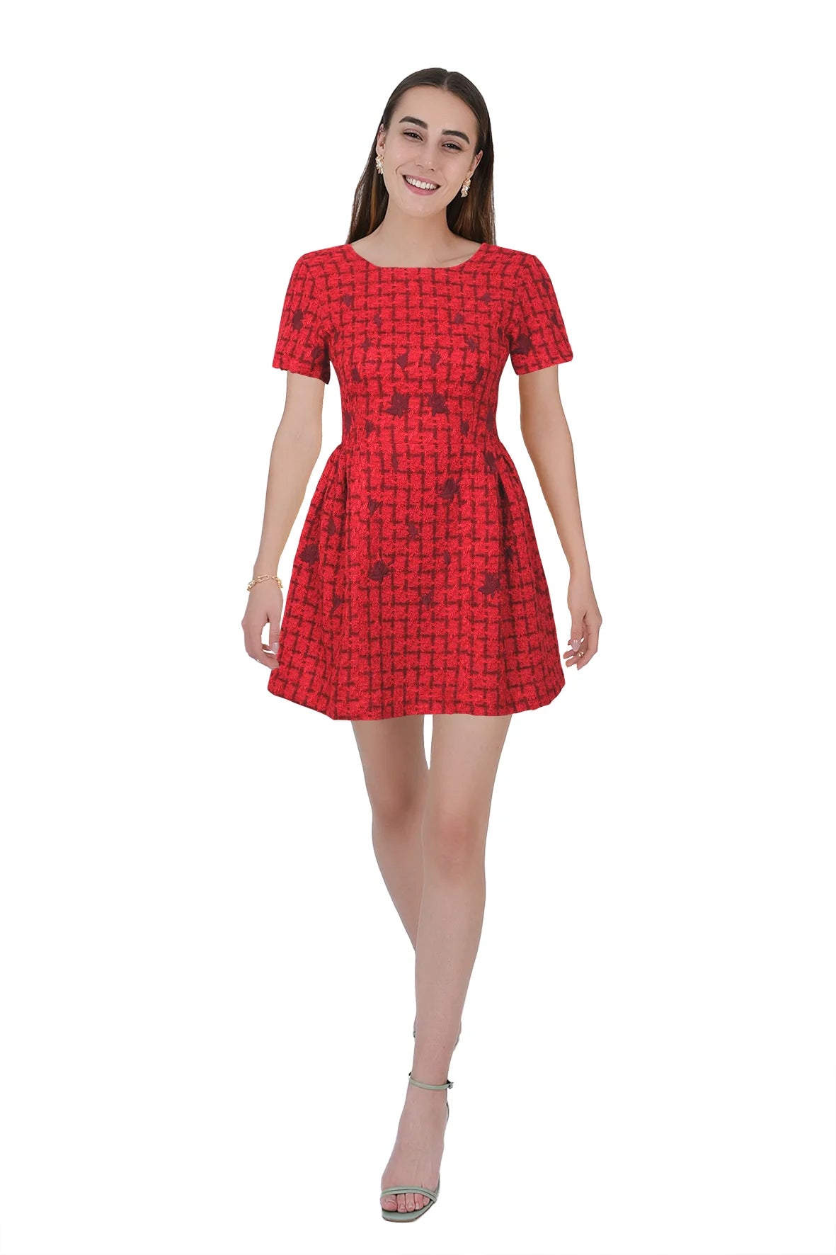 Turn heads with this playful and chic mini dress, designed to flatter with its structured silhouette and fitted bodice. The unique textured fabric adds depth and a modern edge, while the short sleeves and round neckline offer a classic touch. The pleated skirt gives volume and movement, making it perfect for twirling at any occasion.