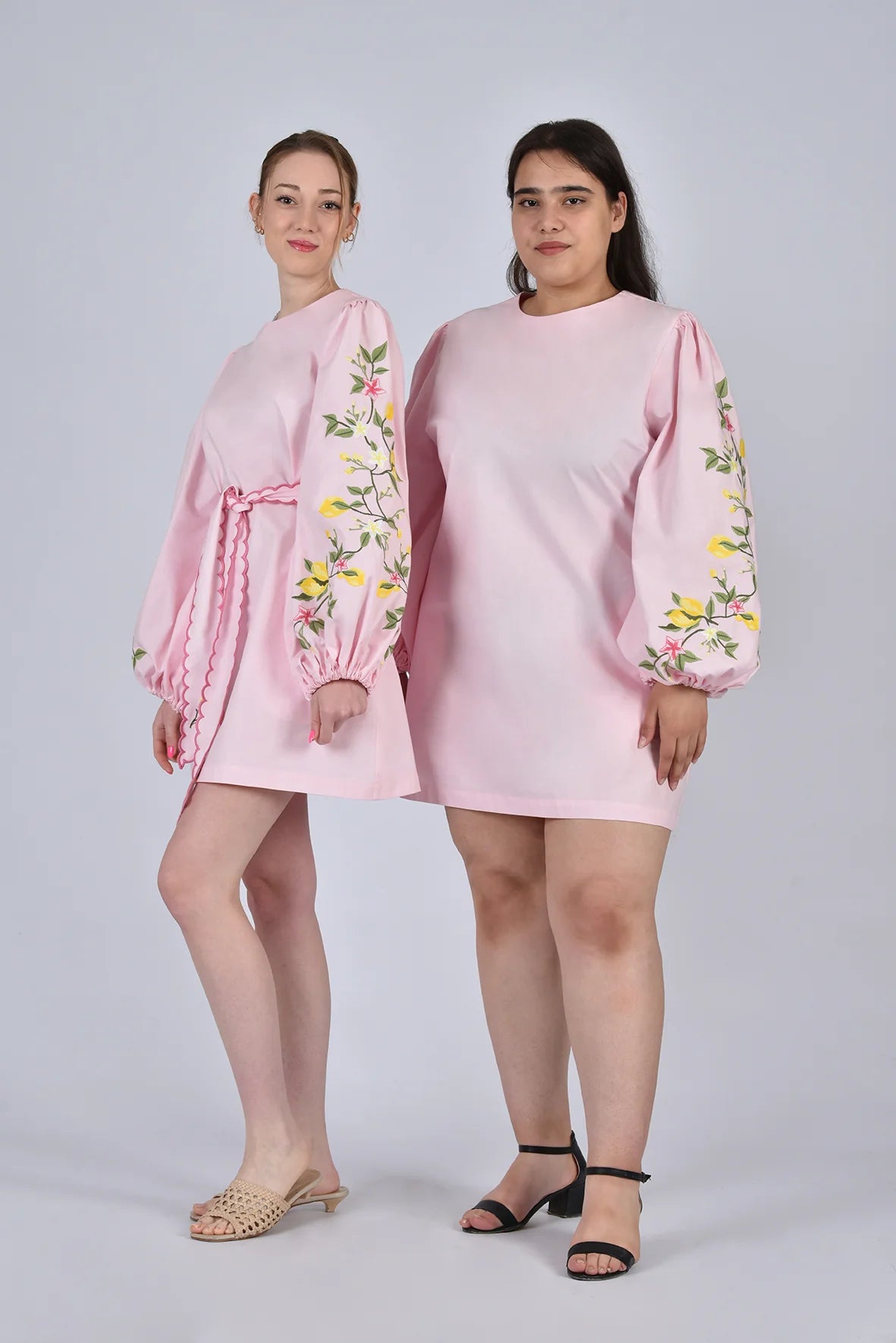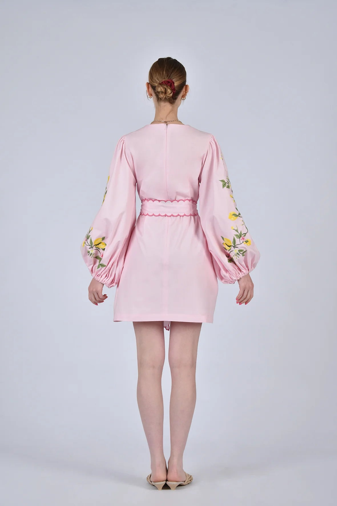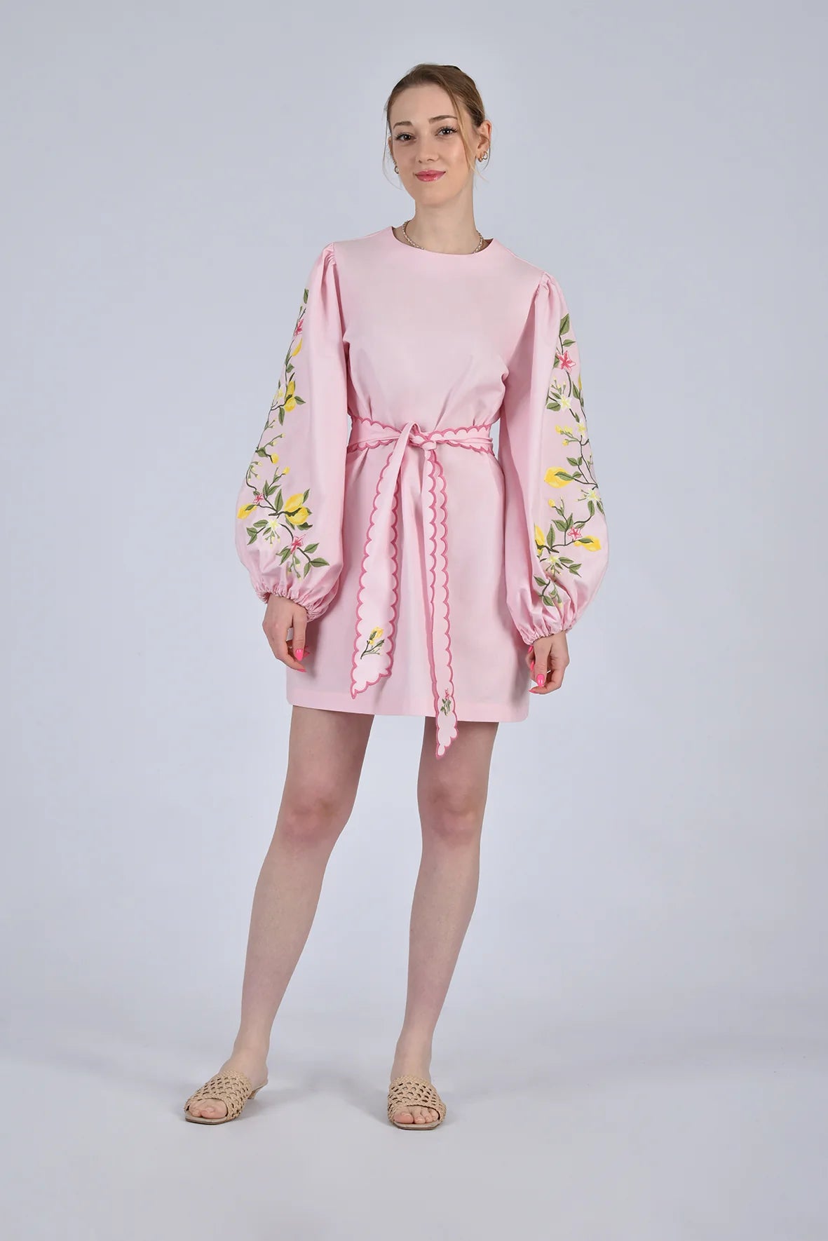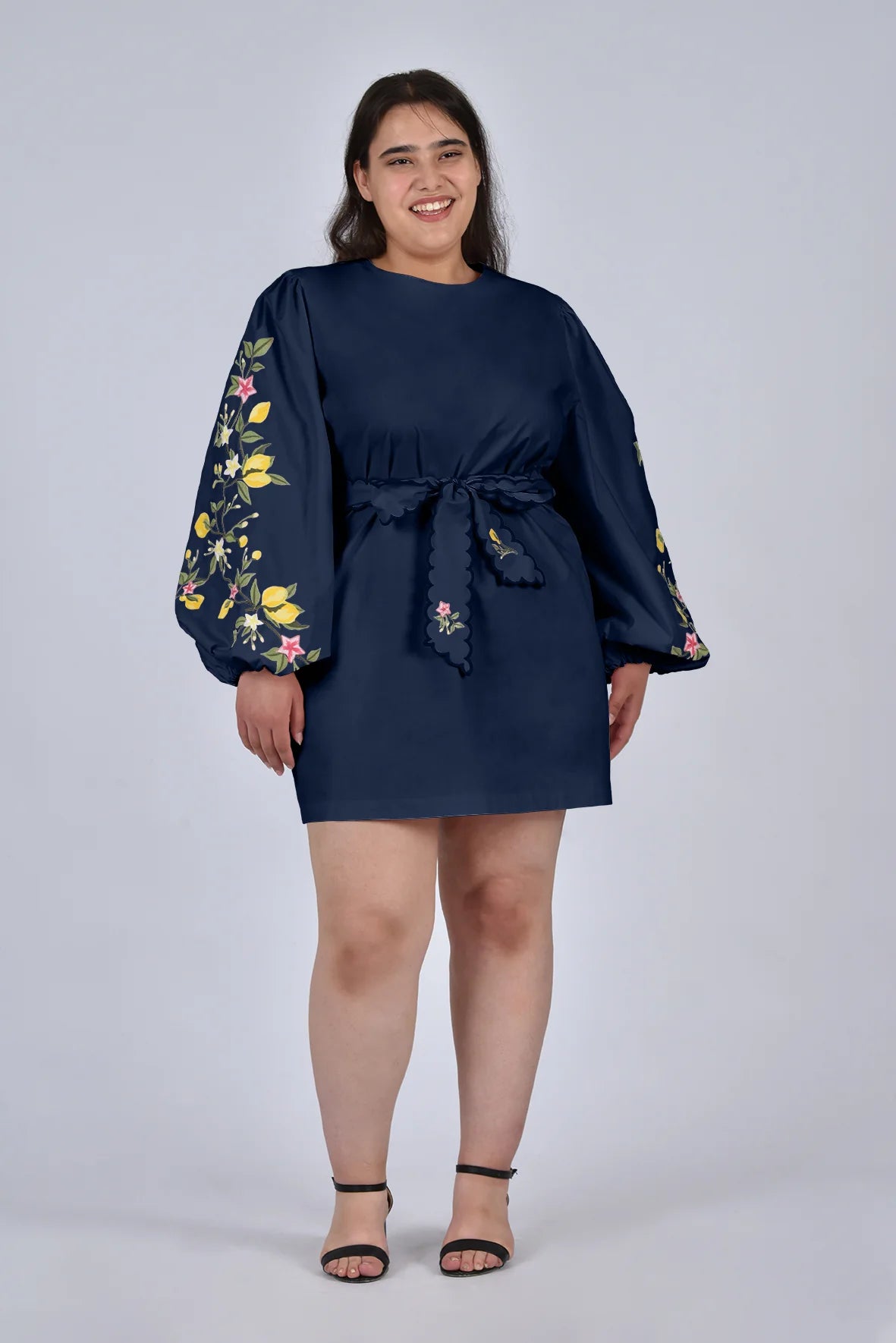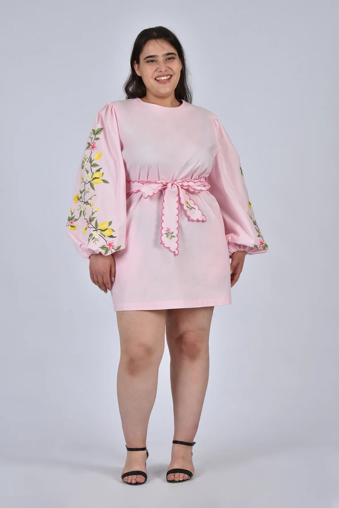 Created in collaboration with Sabrina Chazen & Grace Hamlin, this mini dress features statement balloon sleeves with lemon branch embroidery and a matching scalloped belt. It's an effortlessly charming silhouette perfect for sun-filled days and special summer occasions.