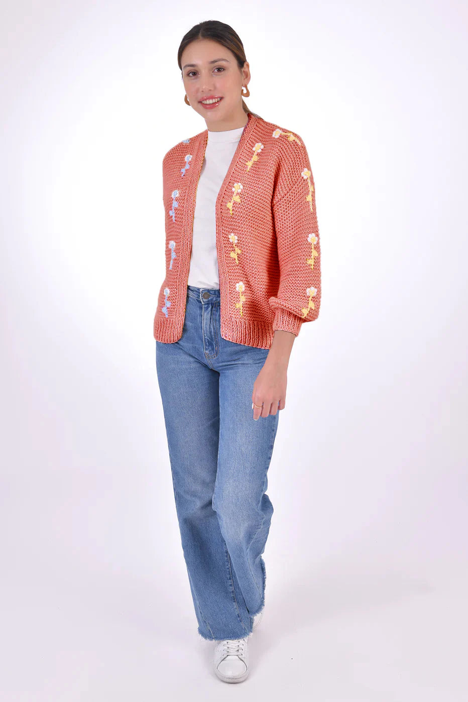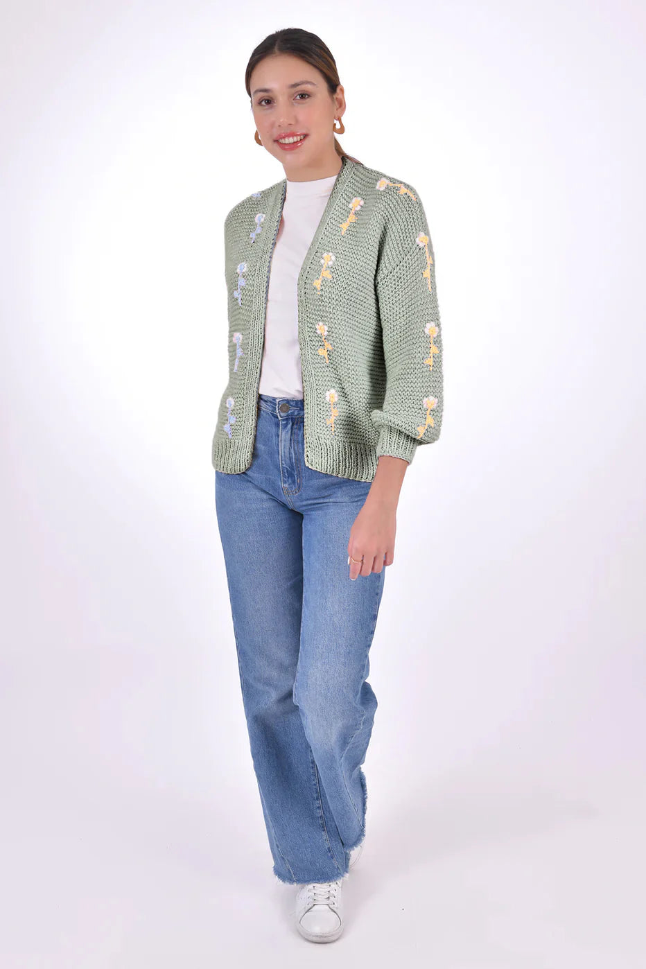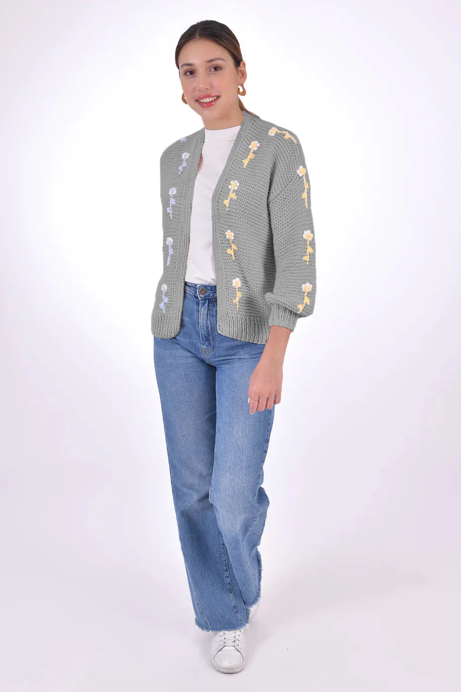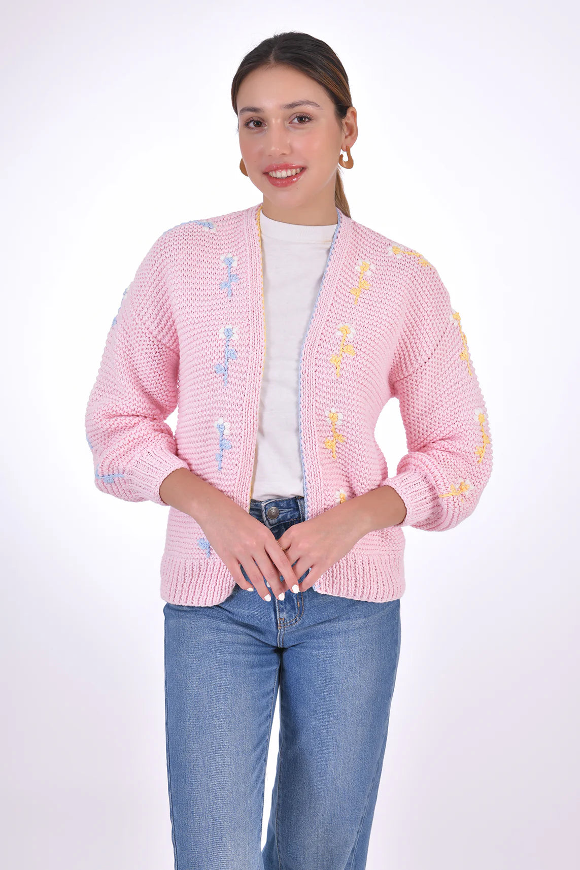 Hand knit and hand embroidered Floral chunky knit open-front cardigan. Made with 100% organic cotton and natural dyes.