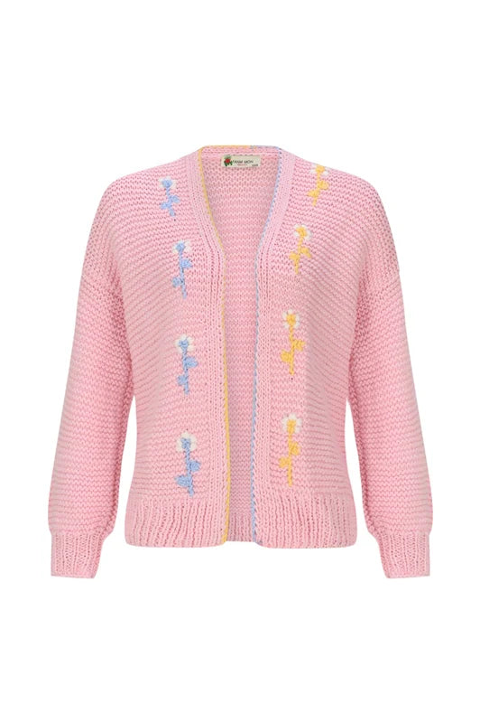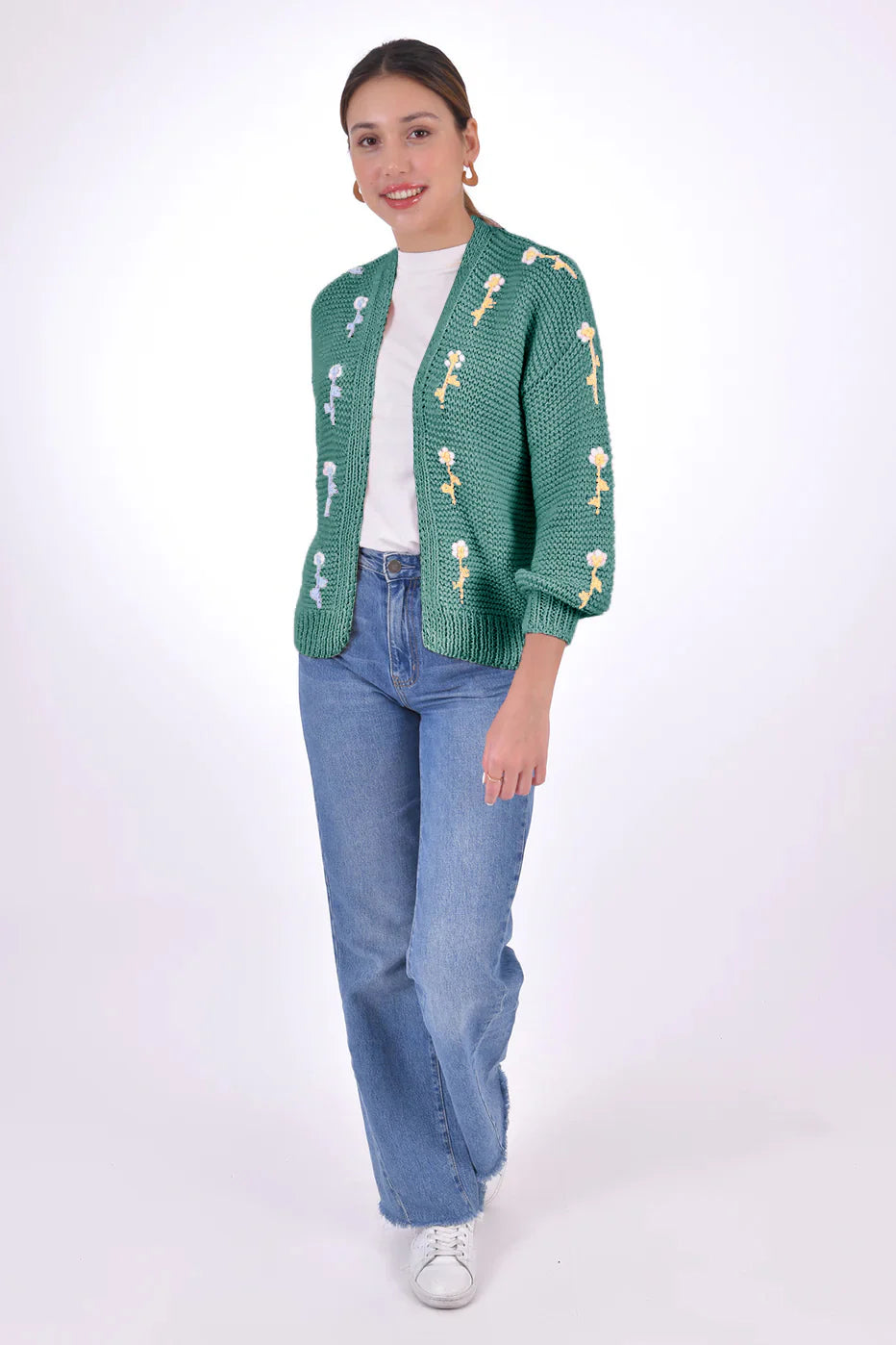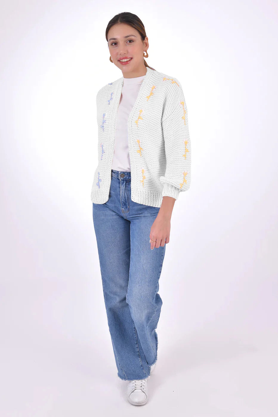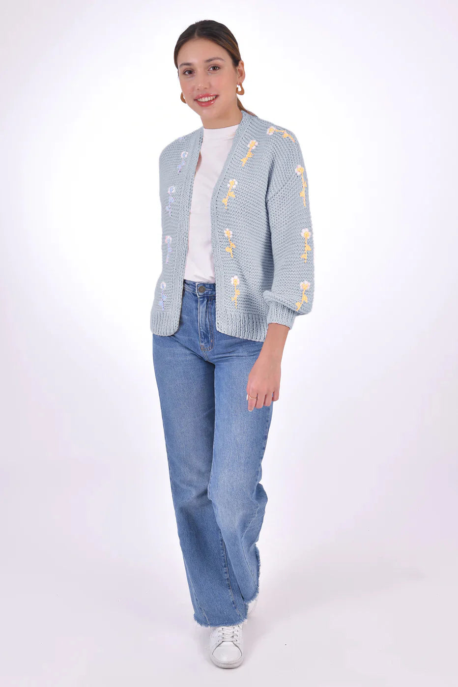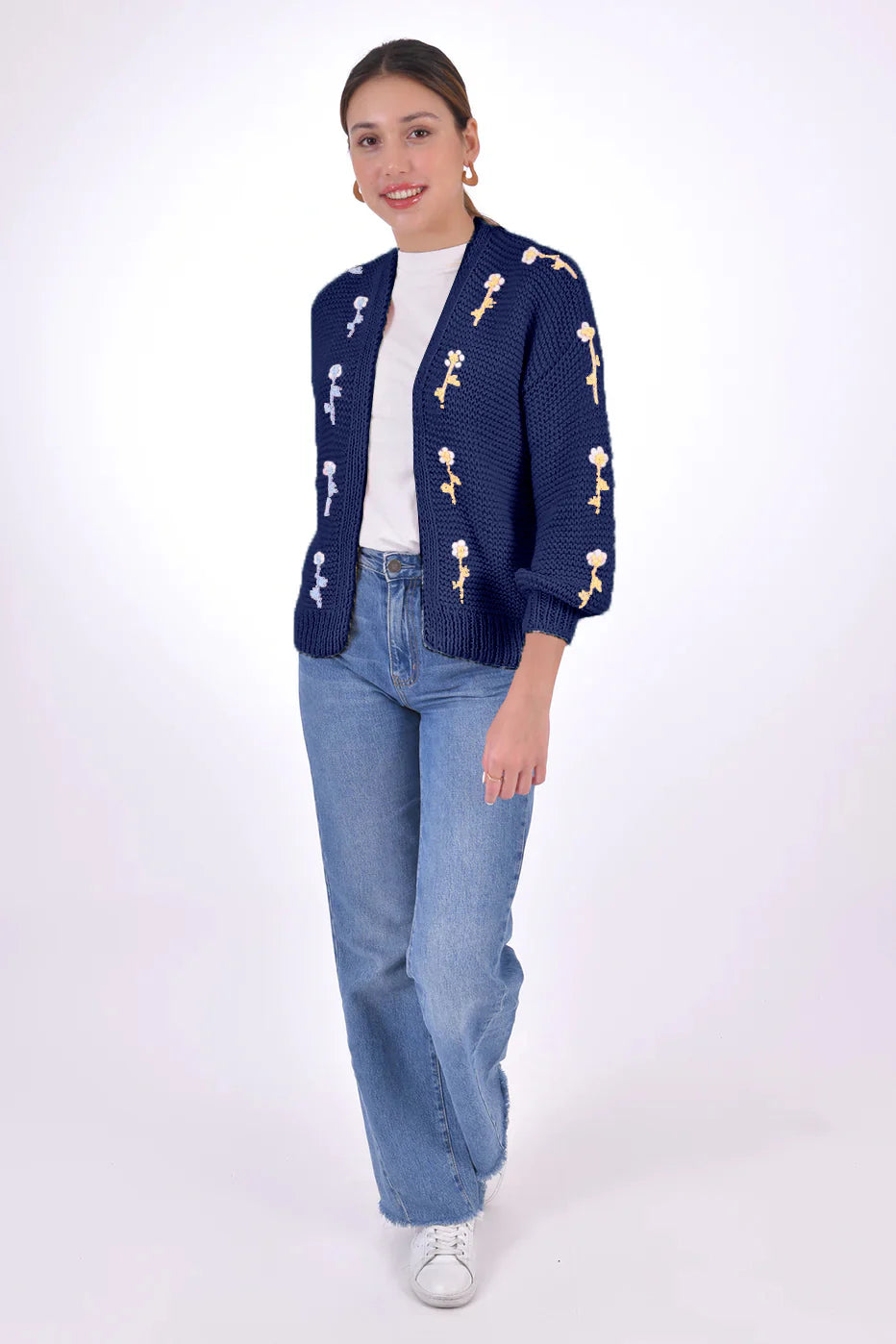 Hand knit and hand embroidered Floral chunky knit open-front cardigan. Made with 100% organic cotton and natural dyes.