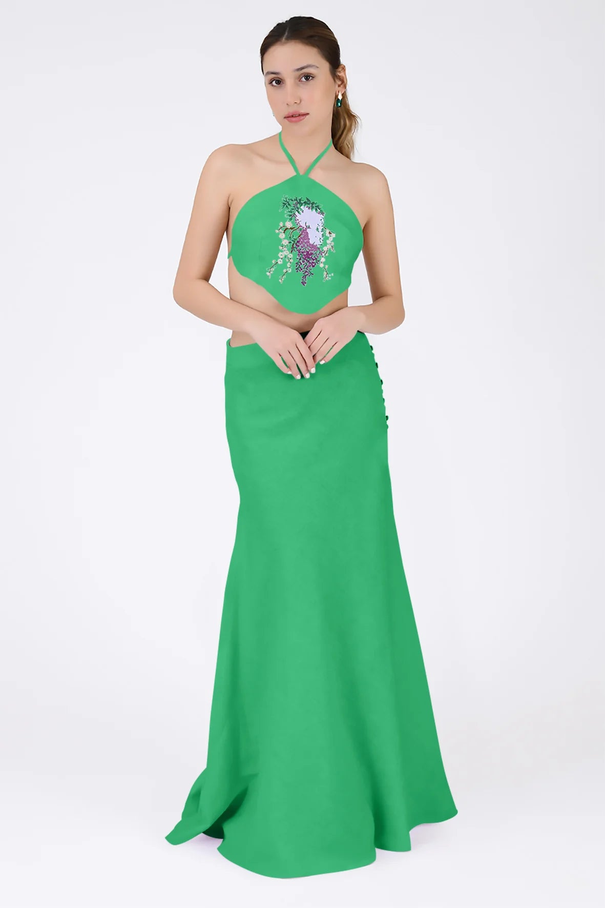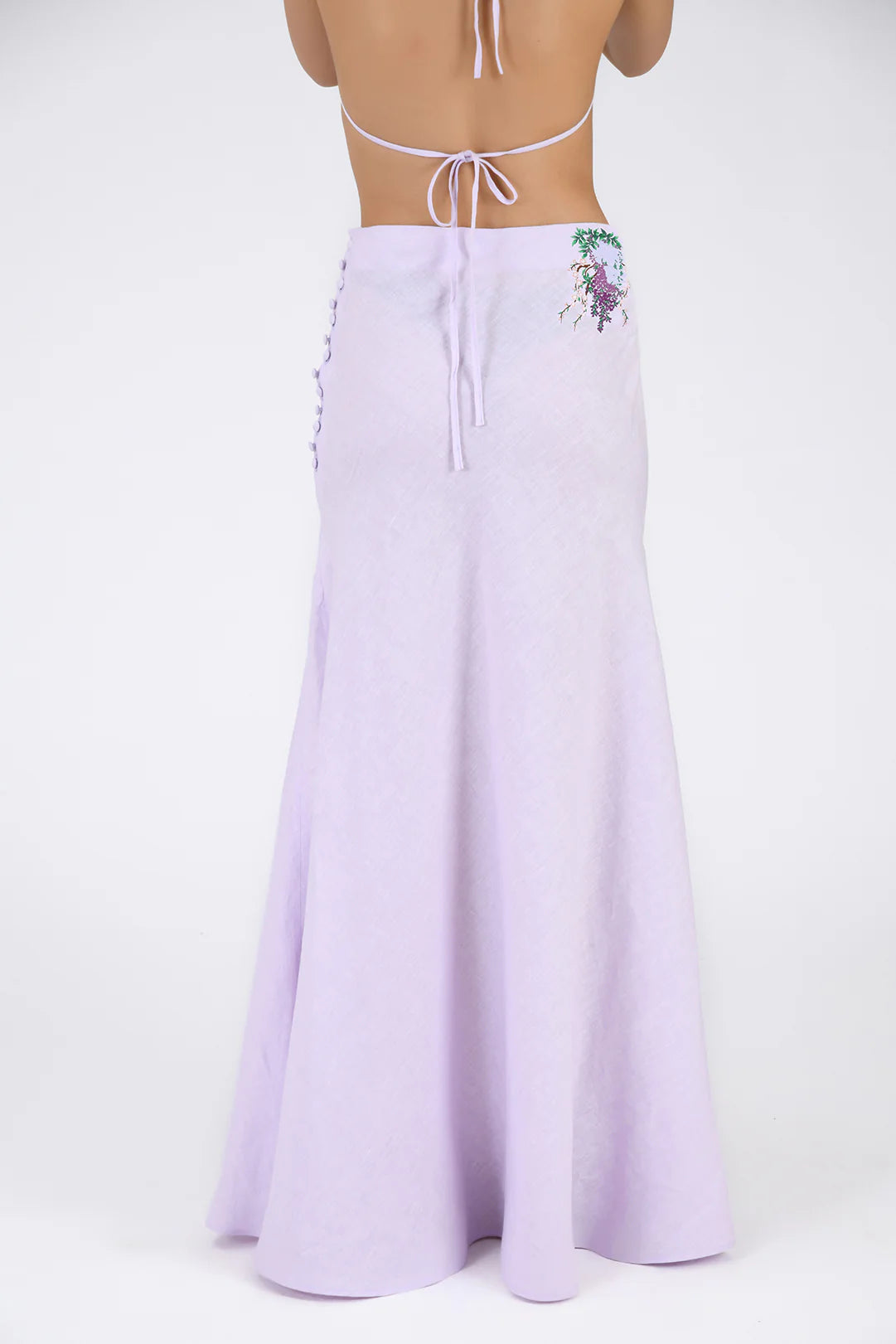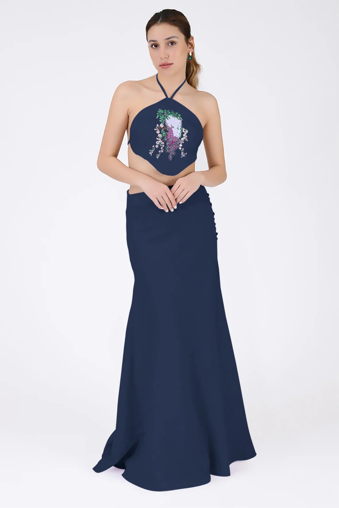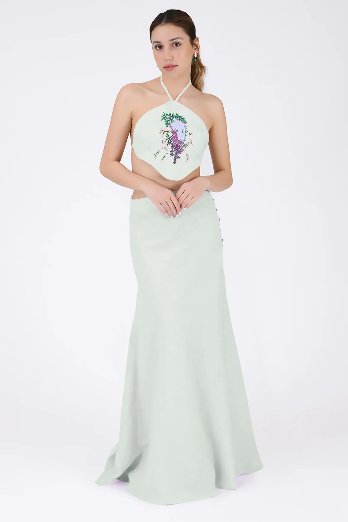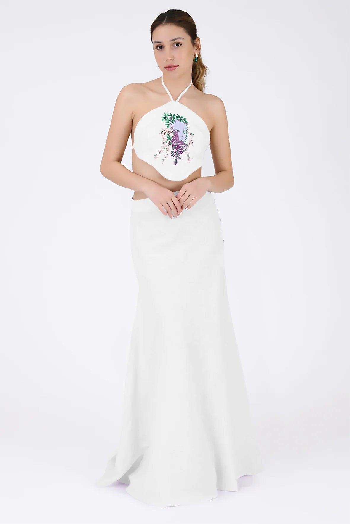 This luxurious 2 piece set features a flowy maxi skirt and a handkerchief halter crop top, both adorned with vibrant floral embroidery inspired by Wisteria.