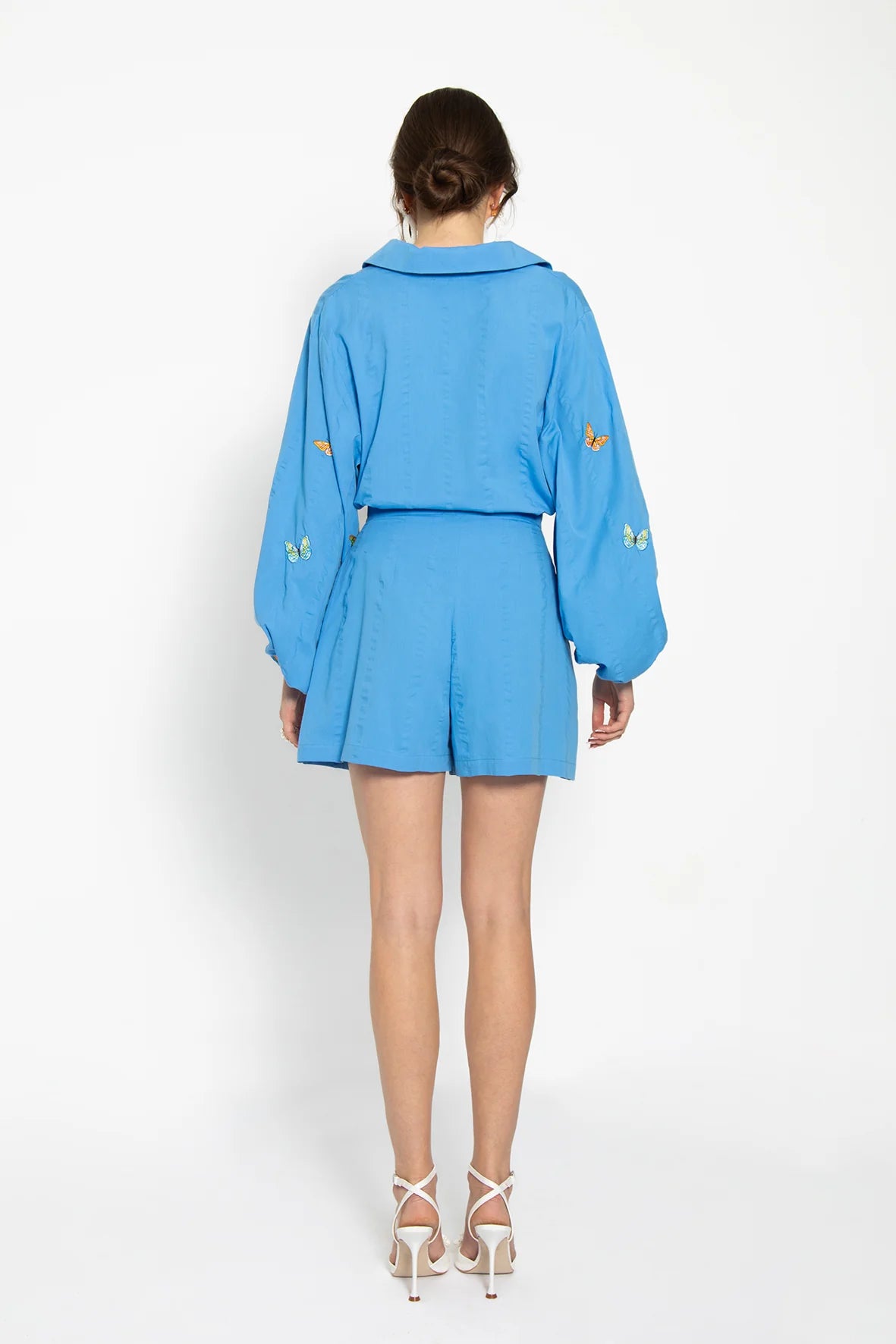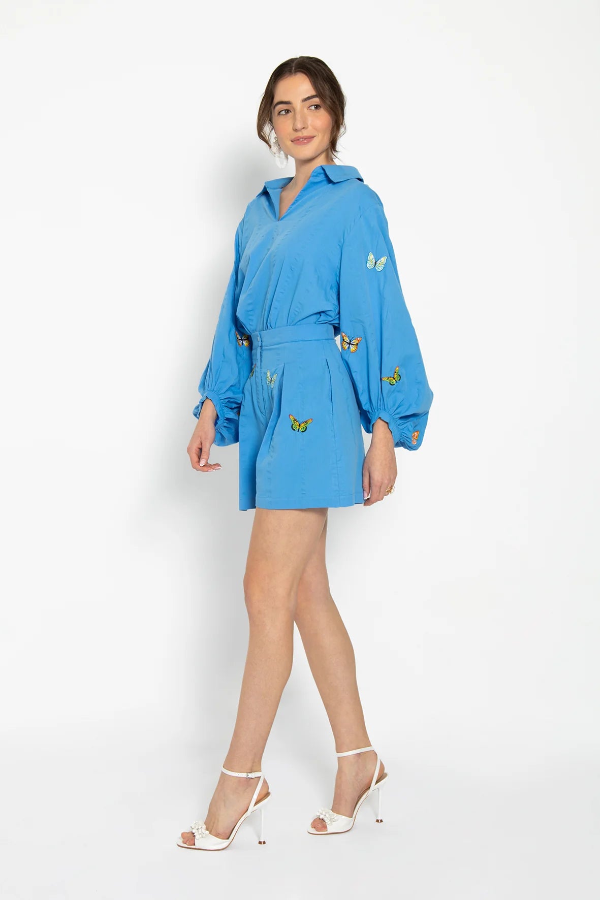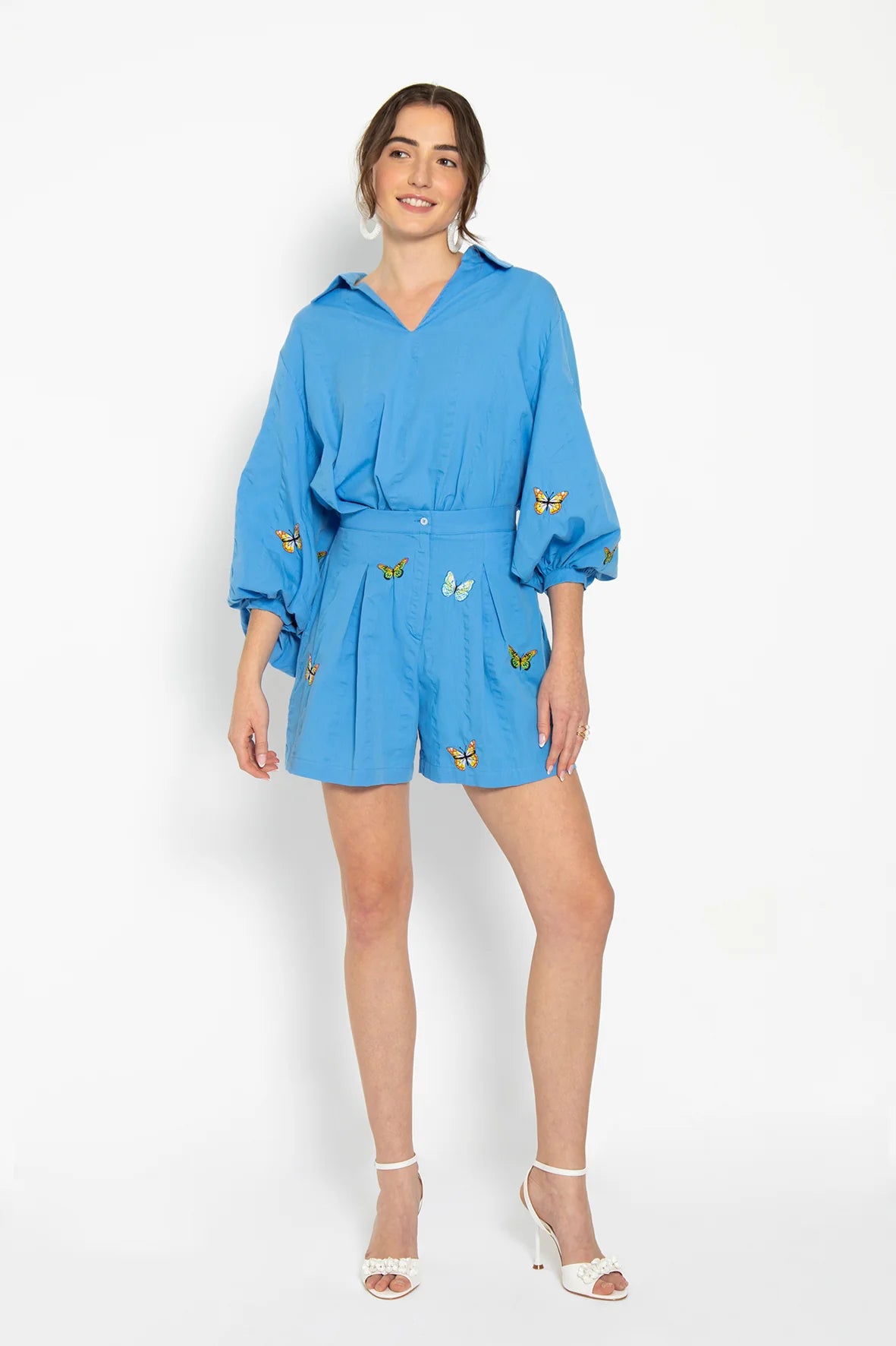 This easy breezy short set features a relaxed silhouette adorned with butterfly embroidery, perfect for a whimsical yet chic look. It combines comfort with delightful details, making it an ideal choice for sunny days.