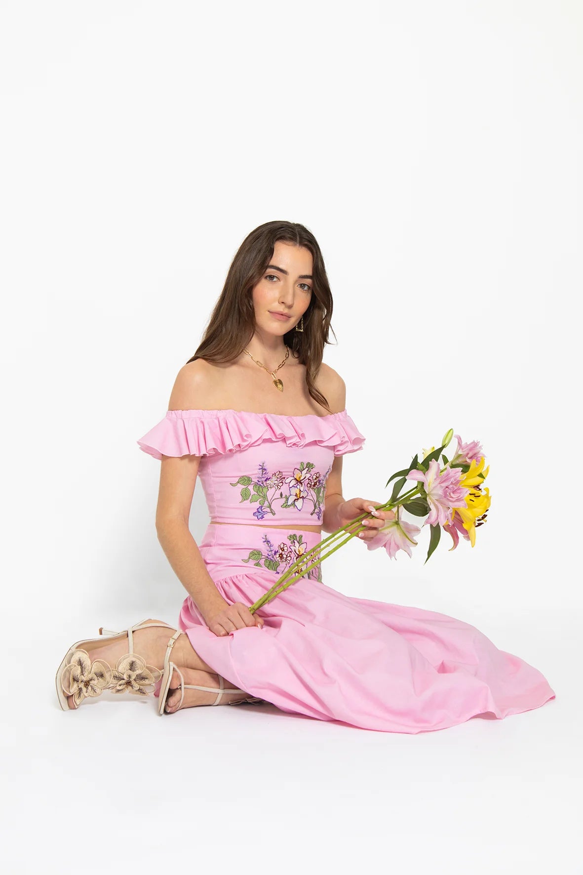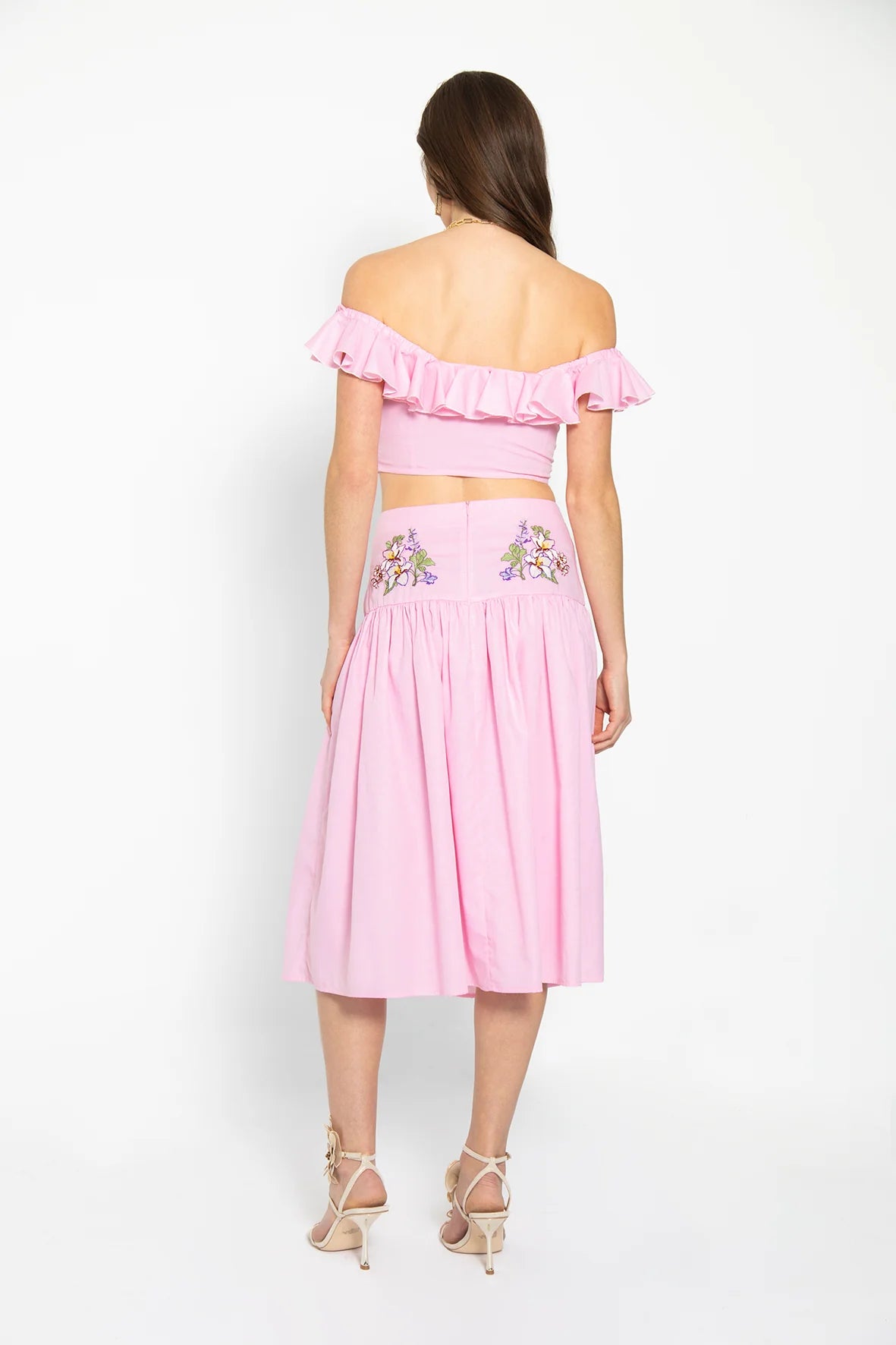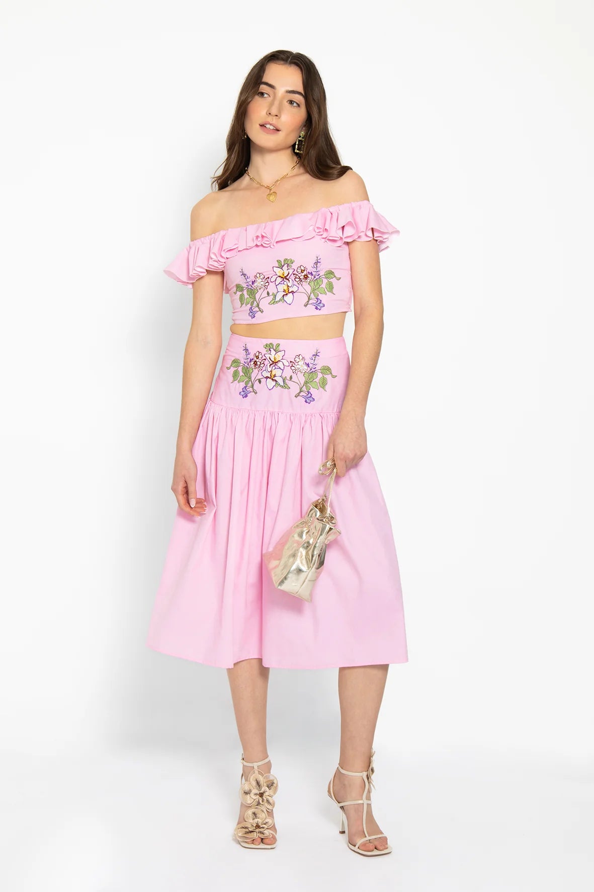 This two-piece set features a textured pink and white cotton fabric with a subtle dot pattern. The off-the-shoulder crop top and drop-waist midi skirt are beautifully embroidered with lilac- and wisteria-inspired florals for a soft, romantic look.